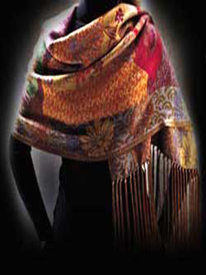 touch of dazzle stylish and very different creation in traditional Pure Pashmina Shawls are made with 100% genuine Pashmina wool. The pure pashmina is lighter, softer and warmer than the pashmina silk shawls, and is offered at a very attractive price. Hand Embroidered Pashmina Shawls & Stoles Made from the finest Pashmina wool foundation these shawls are known for their classic finish. They are tastefully embroidered with natural colours and patterns and this gives a classic Pashmina shawl a more slender silhouette, great drape and an elegant sheen, lightweight and softer feel, and are very durable. A master creation from the finest Pashmina wool on a silk foundation these shawls are known for their classic finish. The silk gives a classic Pashmina shawl a more slender silhouette, great drape and an elegant sheen, lightweight and softer feel, and are very durable. These Fashion Shawls with new range are amazingly soft. We offer a wide range of Designer Shawls from India contemporary.t traditional in designs.
